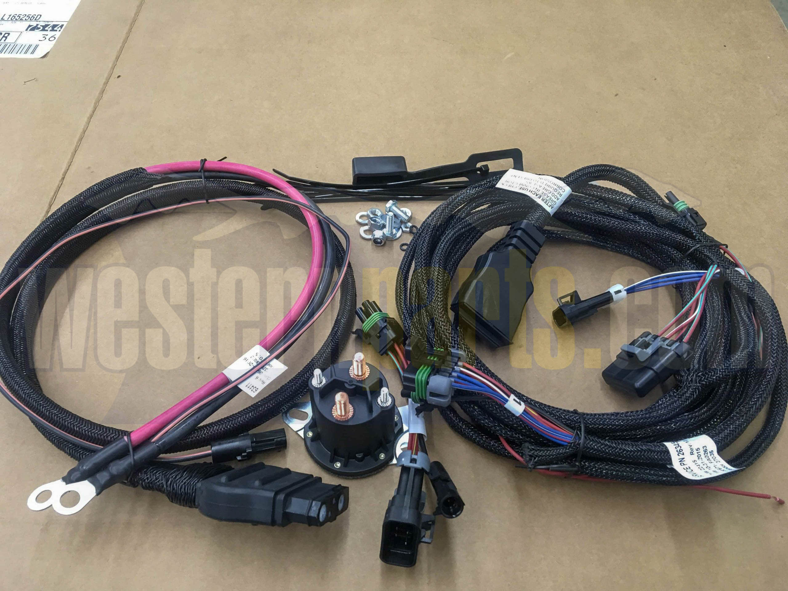 Included in this essential kit are: the 22511K – Positive Battery Lead for direct power connection to your battery; the 56131K-2 – Motor Relay Kit to manage power to the hydraulic pump motor; the heavy-duty 63411 – Vehicle Battery Cable for transmitting ample power; the 26345 – Vehicle Control Harness which provides the main 3-plug connection point; and the 29047 – Adapter for specialized vehicle interfacing. Each component is manufactured to Western’s exacting OEM standards, ensuring optimal performance, durability, and essential protection for your truck’s electrical system against potential plow-related electrical demands, guaranteeing readiness for any plowing task.
