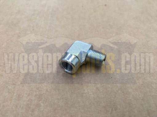 Western Part # 92210K is a Street Elbow with a 1/4-inch nominal pipe size and a 90-degree angle. This fitting is specifically designed for use within the hydraulic systems or other fluid transfer applications on various Western Snow Plow models. The “Street Elbow” designation means it has one male NPT (National Pipe Taper) thread and one female NPT thread, allowing it to connect directly between a female threaded port and a male threaded component, or to extend a line at a 90-degree angle without needing an additional nipple.